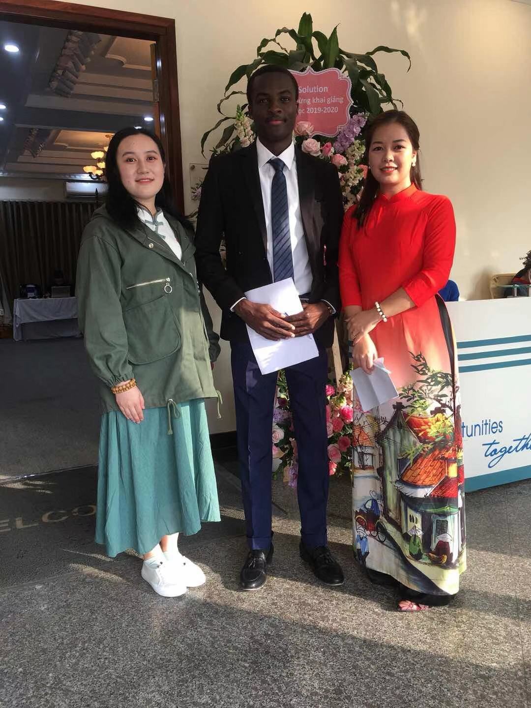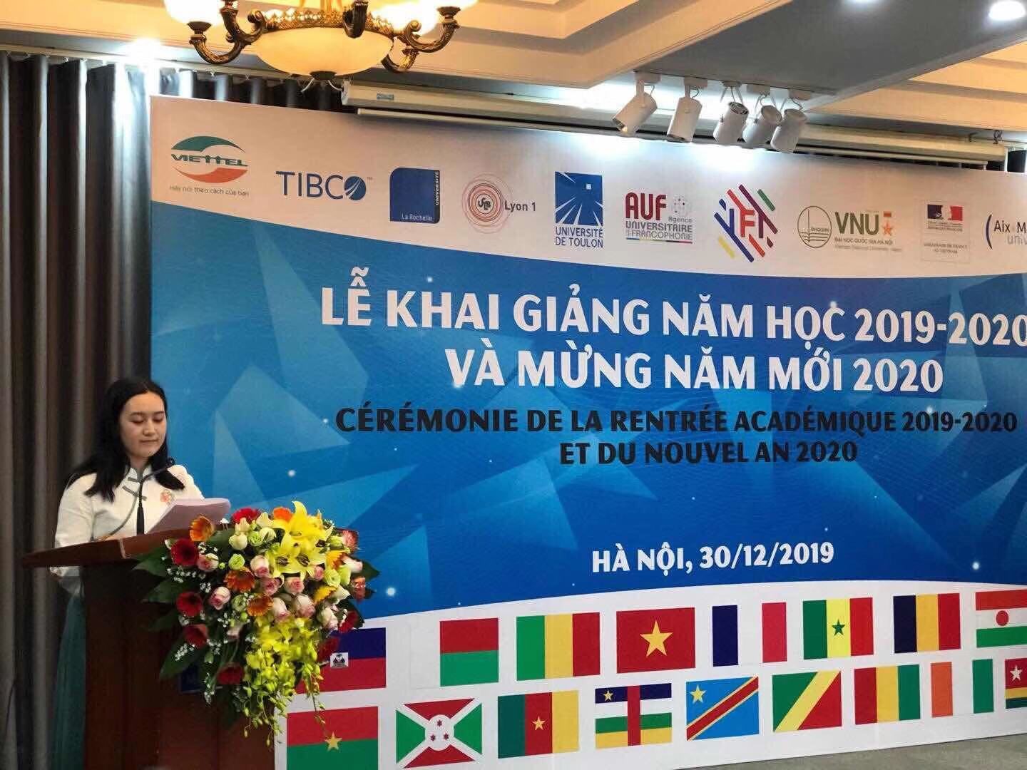 越南河内当地时间2019年12月30日下午15:30,“越南河内国家大学国际法语学院2019-2020学年开学典礼暨新年晚会”在越南河内国家大学的蔡冠深楼举行,杨佳圆同学作为“越南-法国合作项目”接收的第一位中国员工,代表所有新生致词。出席典礼的来宾有越南河内国家大学董事长、国际法语学院经理、各法国合作伙伴大学代表、各越南政商学界人士代表、学院教师及员工等共一百多人。