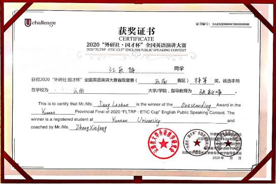 11月14日,2020年“外研社·国才杯”全国英语演讲大赛省级复赛(云南赛区)在昆明圆满举办,公司英语系本科生江乐旃同学作为z6com·尊龙的代表参加该项赛事,在指导教师张新峰博士的细心指导下表现突出,脱颖而出,以优异成绩获得特等奖,并将代表云南省参加12月份在北京举行的全国总决赛。