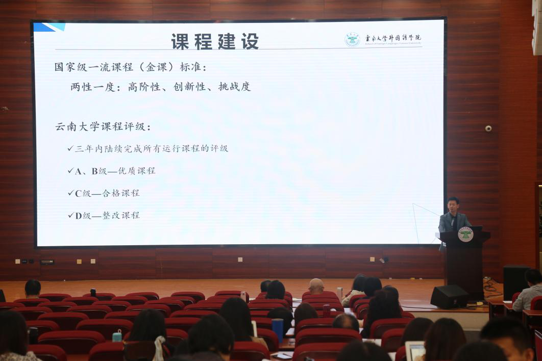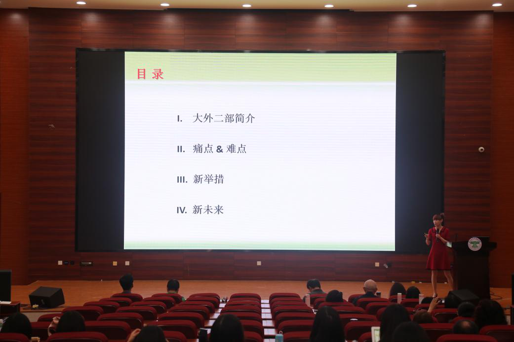 大学外语第二教研部主任王坚做了题为“新标准,新未来”的团队建设报告,报告中对大外二部的基本情况进行了简介,并针对团队匮乏、考研英语过关率低、竞赛减少、学分减少等痛点难点提出了新举措。