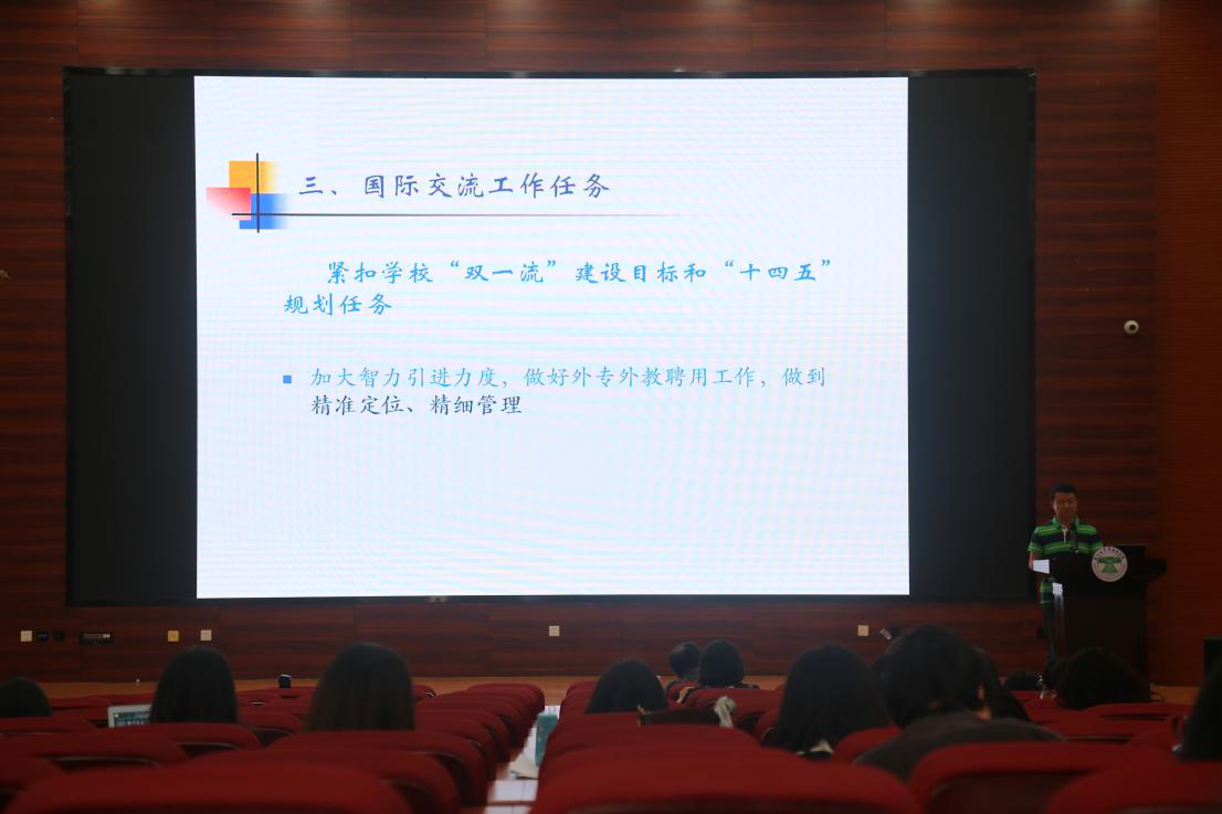 王浩副经理用“两个全面”说明了国际交流工作目标,用“两个方向”说明工作内涵,提出紧扣学校“双一流”建设目标和“十四五”规划任务,并用“规范管理”和“稳中求进”概括了未来的工作计划。