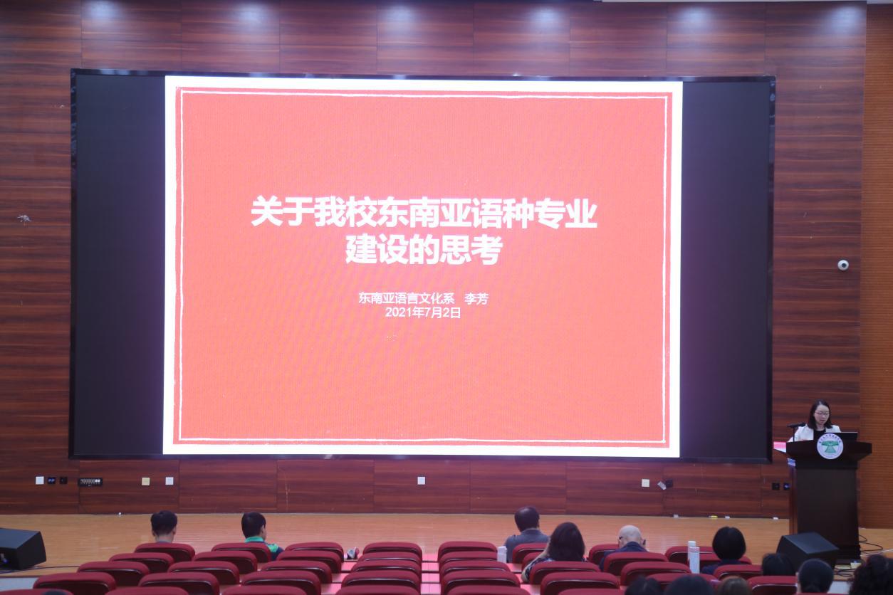 东南亚语言文化系主任李芳从东南亚语种专业群的开设历史与现状、外国语言文学学科内涵、东南亚语种专业定位等方面进行了介绍,并提出了新形势下东南亚语种专业的发展方向,提出了关于公司东南亚语种专业建设的思考。