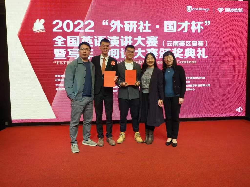 11月4日,2022年“外研社·国才杯”全国英语演讲大赛省级复赛(云南赛区)在昆明理工大学文汇酒店成功举行。公司英语系张新峰老师指导的2019级本科生黄思越同学获得了特等奖第一名的好成绩,将代表云南省参加12月在北京举行的全国总决赛。同时,公司王文俊老师指导的民社院研究生凤杰同学也获得了特等奖,赢得了进军北京决赛的入场券。两位指导老师荣获“外研社·国才杯”全国英语演讲大赛省级复赛(云南赛区)指导教师特等奖。