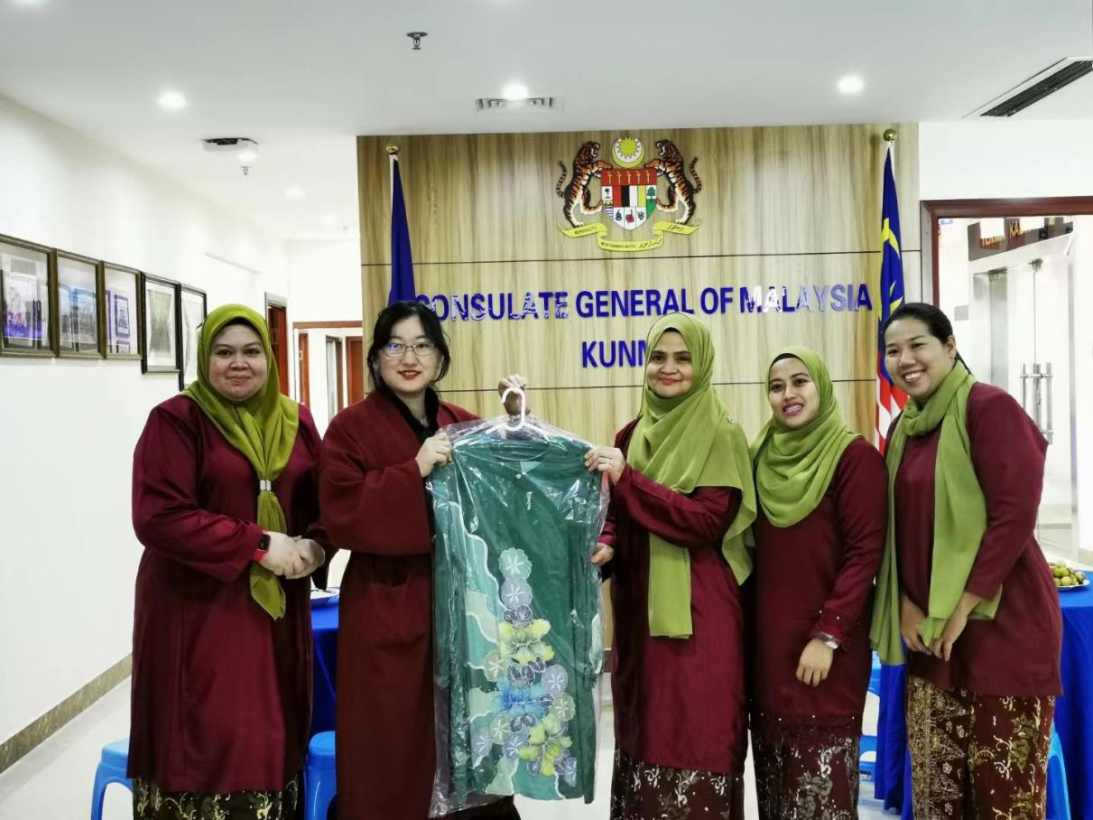 马来西亚驻昆明总领事馆领事夫人(右三)及领事馆妇女代表向z6com·尊龙马来语专业赠送马来服装