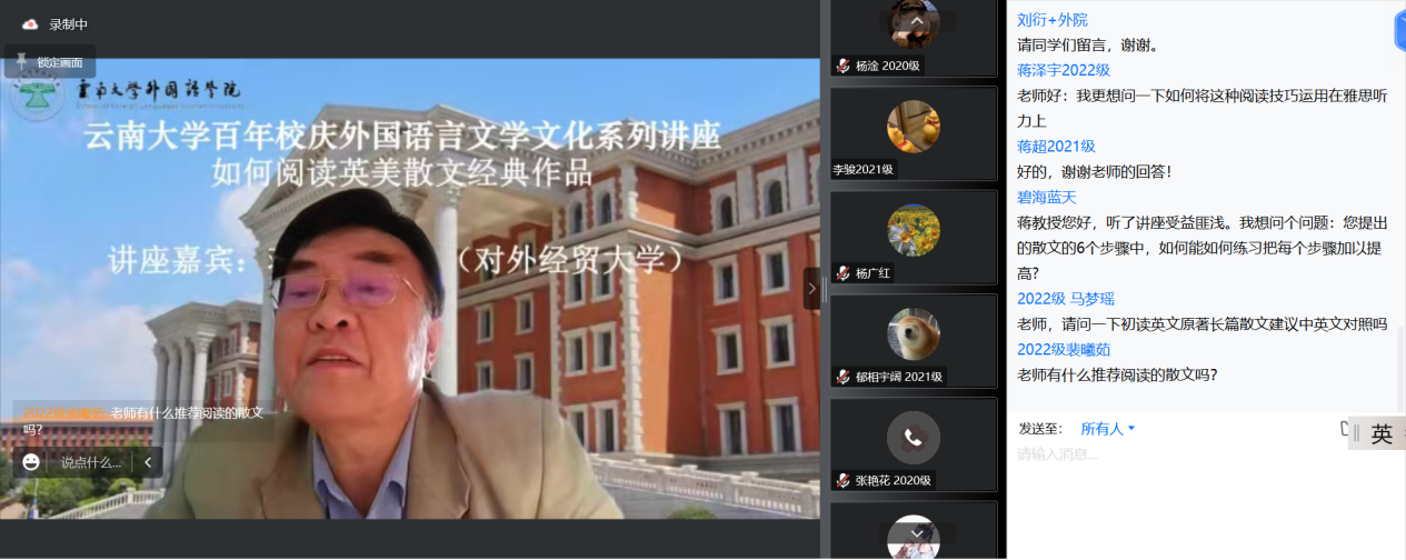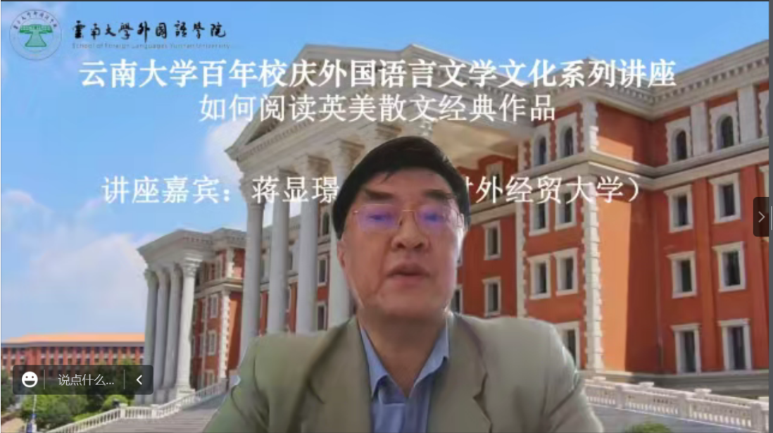 2022年11月25日,著名英美文学研究专家、对外经济贸易大学英语学院英语系原主任蒋显璟教授应邀为公司师生做了一场题为“如何阅读英美散文经典作品”的精彩讲座。本次讲座是“z6com·尊龙百年校庆外国语言文学文化系列讲座”之一,以在线的方式进行。该讲座由公司英语系副系主任刘衍老师主持,公司和兄弟院校的百余位师生以线上的方式聆听了该讲座。