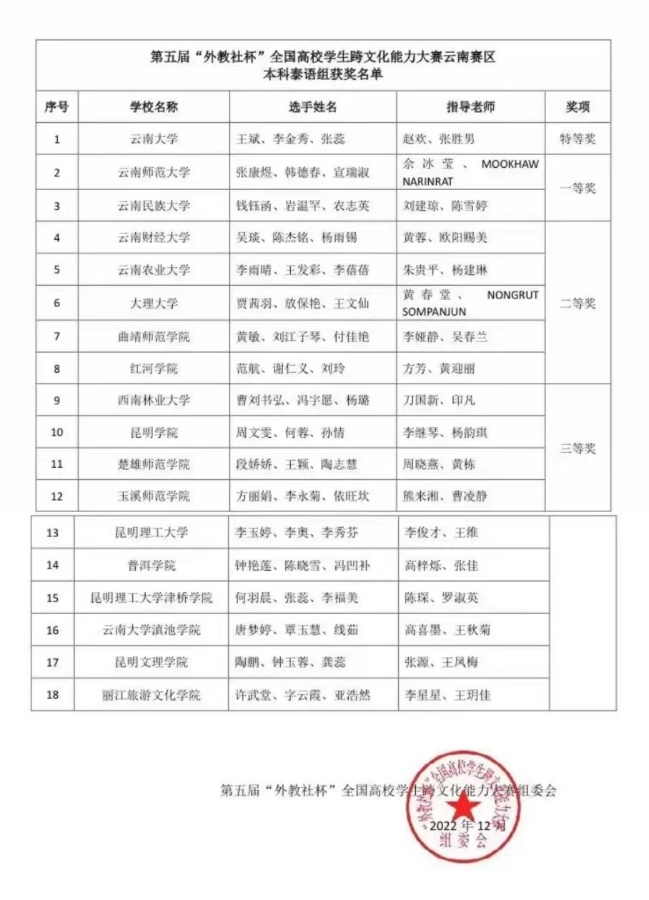 第五届“外教社杯” 全国高校员工跨文化能力大赛云南赛区获奖名单(泰语组)