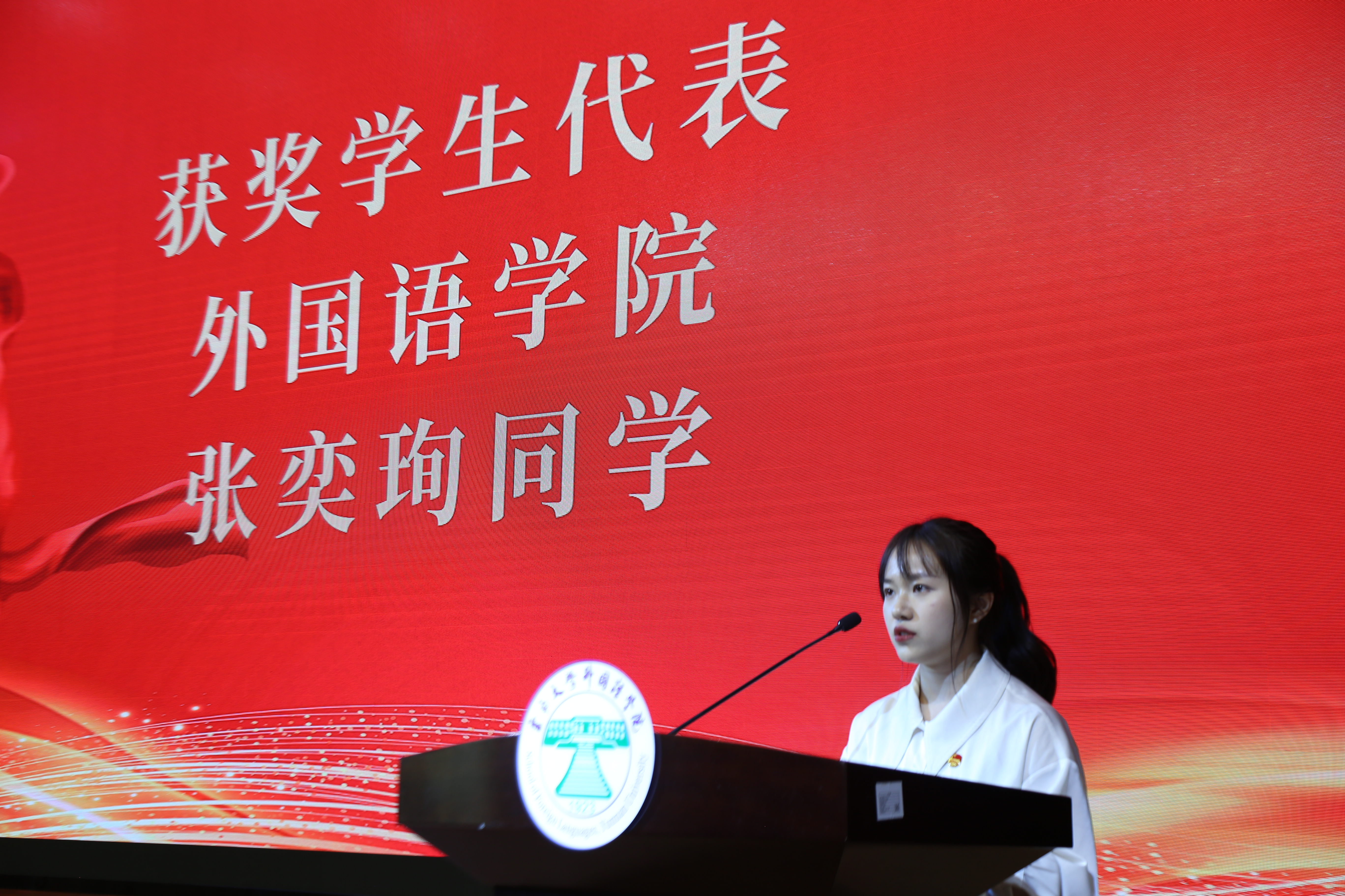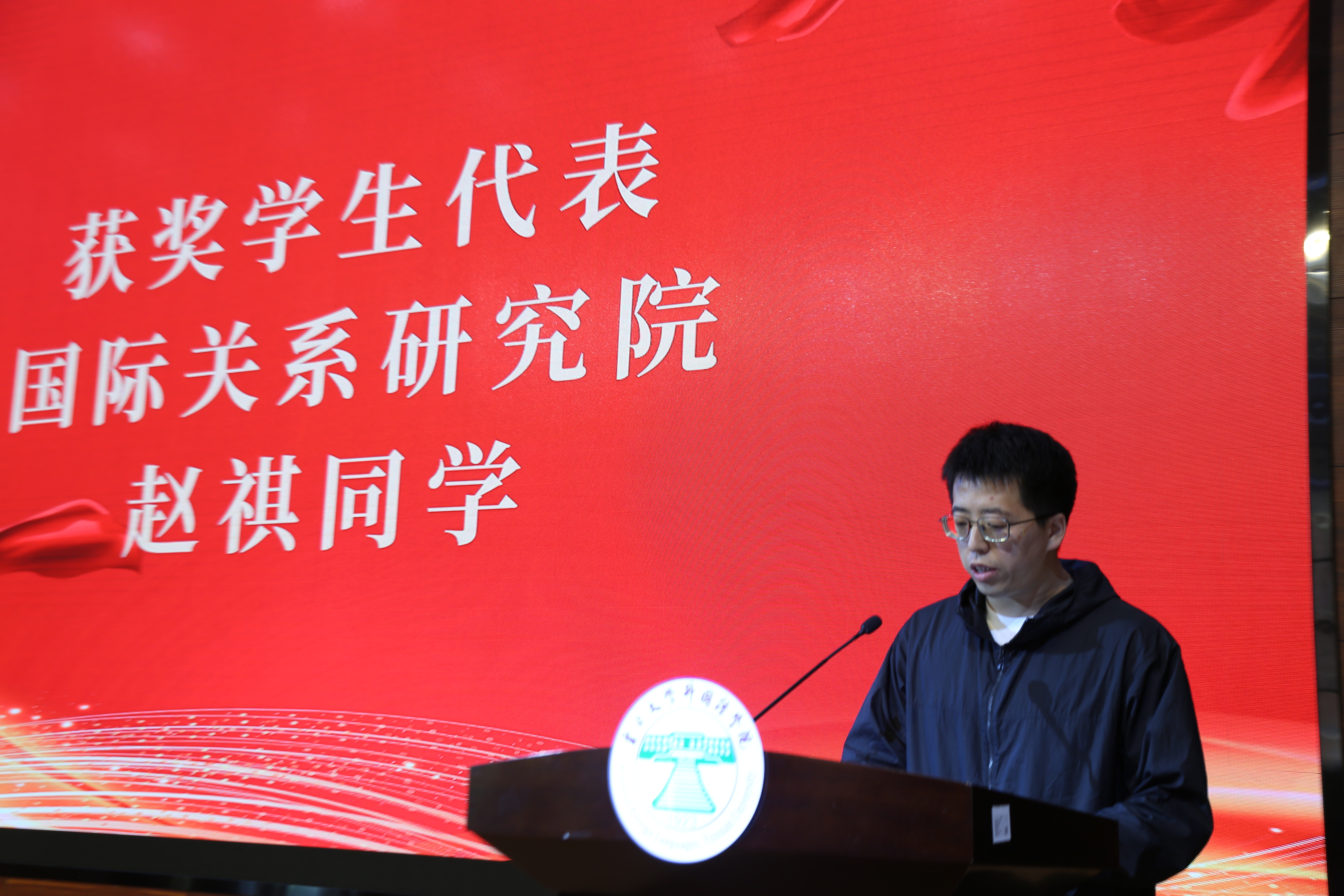 获奖员工代表依次上台发表获奖感言。国际关系研究院获奖员工代表赵祺同学,向研究过程中提供了帮助和指导的师长们表达感谢,同大家分享了科研中应该更加静心用心的研学心得,希望自己能在圣达奖学金的激励下,在今后的研究道路上钻得深、行得远。