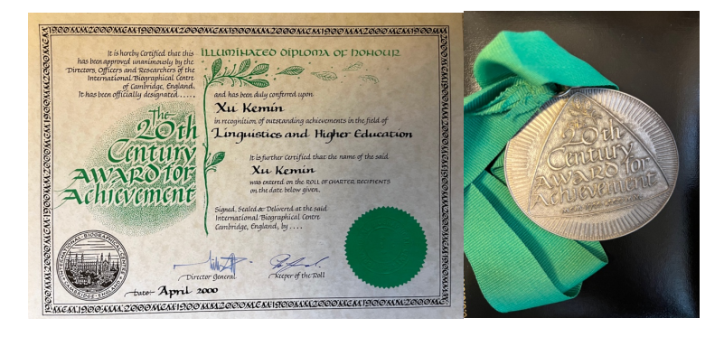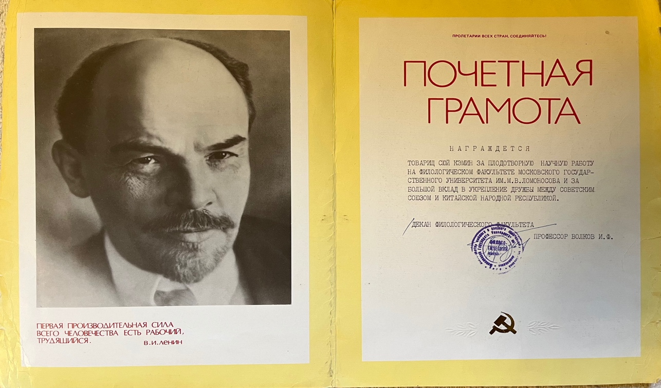 在莫斯科的大学的一年多的时间里面,我讲了三门课,一门是这个中苏当代文学的比较,中国研究苏联当代文学的现状,云南文化等课程,并且在莫斯科大学学报上发表了三篇文章,同苏联的这个莫斯科大学的俄罗斯文学的教研室主任合编了的苏联当代文学的一书。由于这个原因,在1988年的8月,在学校开会的时候,由于我的科研成果和员工会的这些工作,授予我荣誉奖状。这奖状上面俄文说的大概是本奖状授予许克敏,为他出色的科研成果和为中苏、苏中两国人民的友谊做出的巨大贡献,特授予本奖状,荣誉科研奖状。这个是莫斯科大学的,还有个奖状是20世纪杰出学者和20世纪成就奖,这个奖状还配一个奖章,上面有我名字,因为我在高等教育的研究和语言教学方面的研究,是联合国剑桥名人传记中心发的,时间是2000年4月。