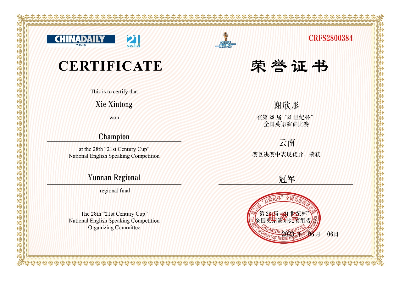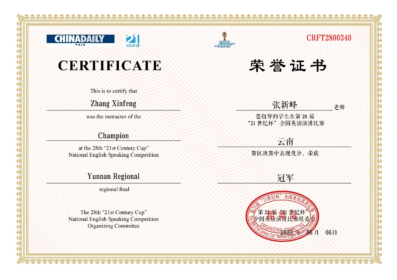 6月18日,第28届“21世纪杯”全国英语演讲比赛云南地区决赛在昆明文理学院落下帷幕。公司英语系张新峰老师指导的2021级本科生谢欣彤同学获得冠军,将代表云南省参加8月举行的全国总决赛。