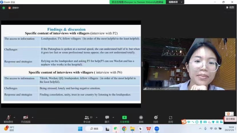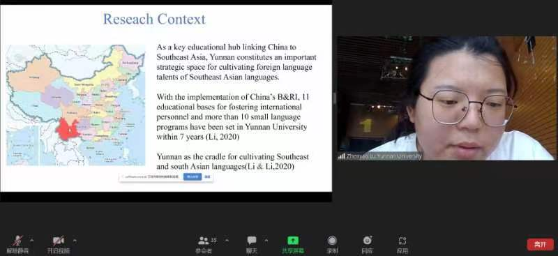 两位同学通过线上参会方式与全球学者分享多语研究成果。罗梦怡同学的研究以越南语专业员工为研究对象,采用语言社会化理论探讨越南语学习过程中的动态复杂特征;陆振瑶同学通过中越边境壮族村落收集到的民族志数据,采用应急语言学理论探讨少数民族聚集地语言服务话题。两位同学的研究话题来自于我国西南边疆地区日常语言生活实践,采用社会语言学前沿理论,探讨个体语言使用特征与社会文化生活之间的互动关系。
