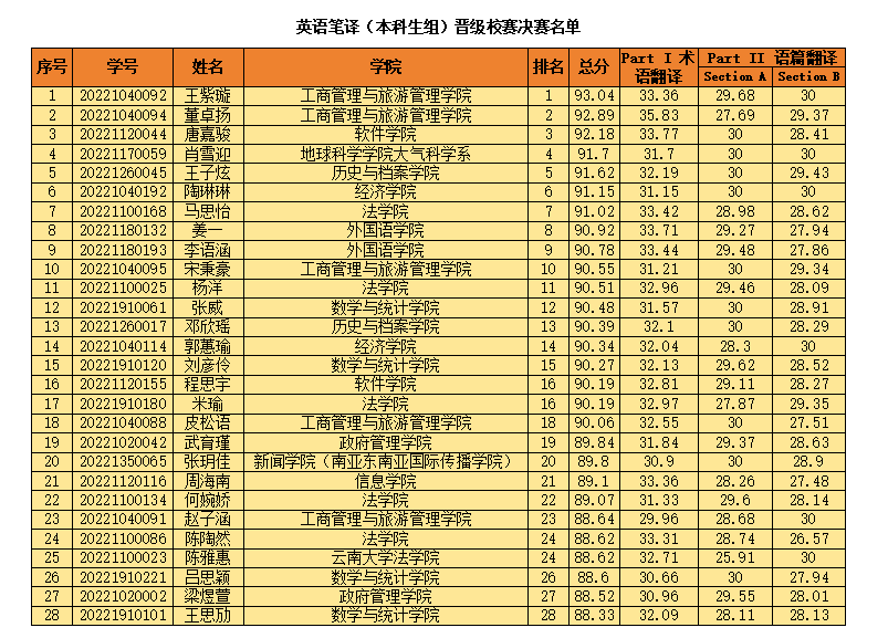 各位同学:外语能力大赛非英语专业类“英语笔译”的校赛决赛晋级名单已经产生,详见以下两个Excel表格。请名单内的同学注意以下事项: