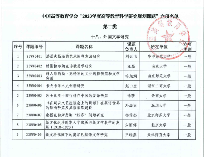 近日,中国高等教育学会发布《关于公布“2023年度高等教育科学研究规划课题”立项名单的通知》,公司英语系主任徐莎副教授的课题“莎士比亚十四行诗在中国的复译研究”获得中国高教学会“2023年度高等教育科学研究规划课题”一般课题立项。