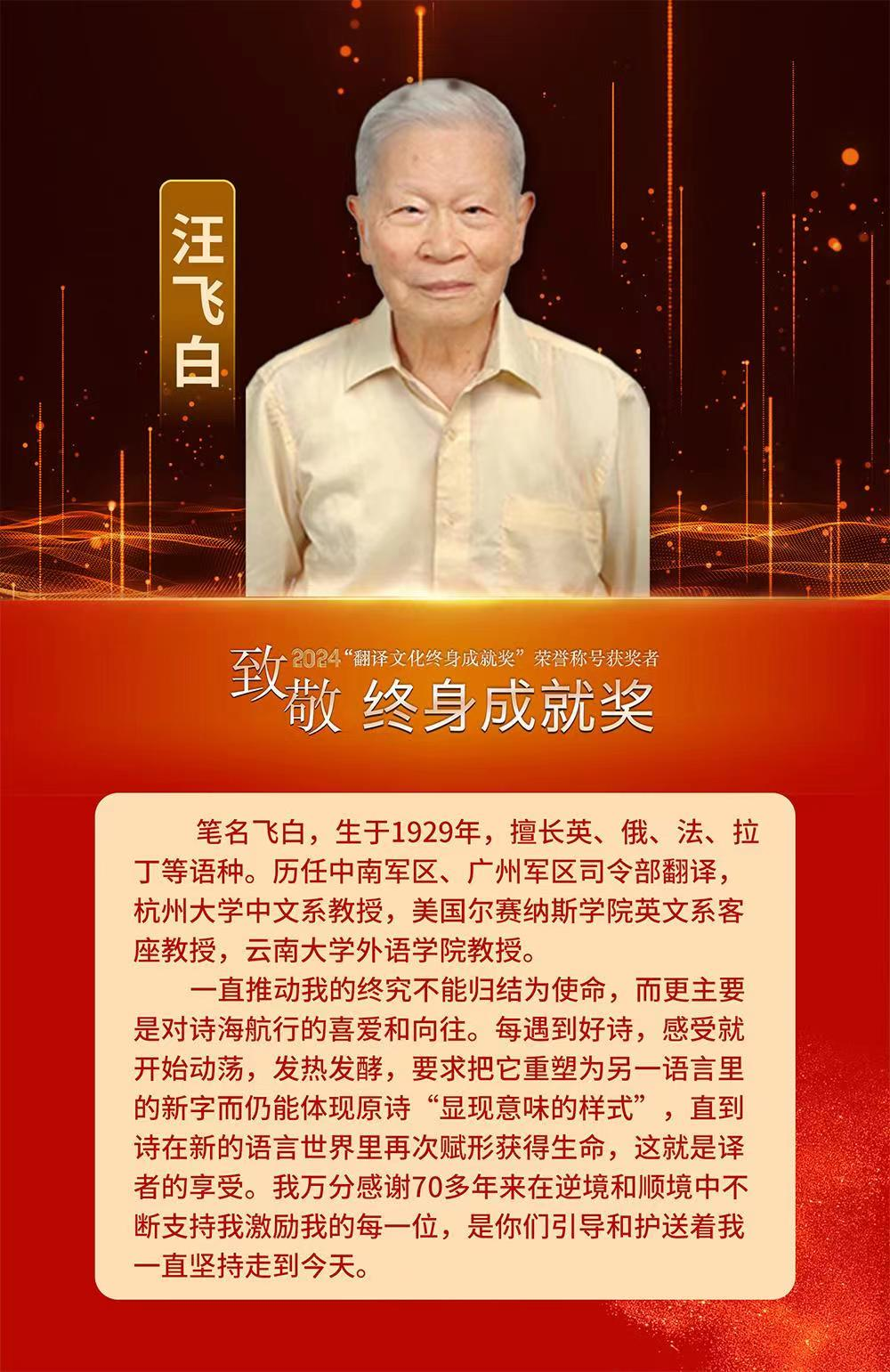 中国翻译协会2024年会3月30日-31日在长沙举行,本次年会由中国外文局、中共湖南省委宣传部、中共湖南省委外事工作委员会办公室、湖南省教育厅指导,中国翻译协会、中国外文局翻译院、湖南师范大学主办。在30日开幕式上,举行了中国译协“翻译文化终身成就奖”等奖项的颁奖表彰仪式,授予曾任毛泽东主席、周恩来总理等党和国家领导人翻译的唐闻生等13位著名翻译家“翻译文化终身成就奖”的称号。其中,在公司英语系长期执教、培养研究生近20年的著名外国文学翻译家汪飞白教授荣膺“翻译文化终身成就奖”。
