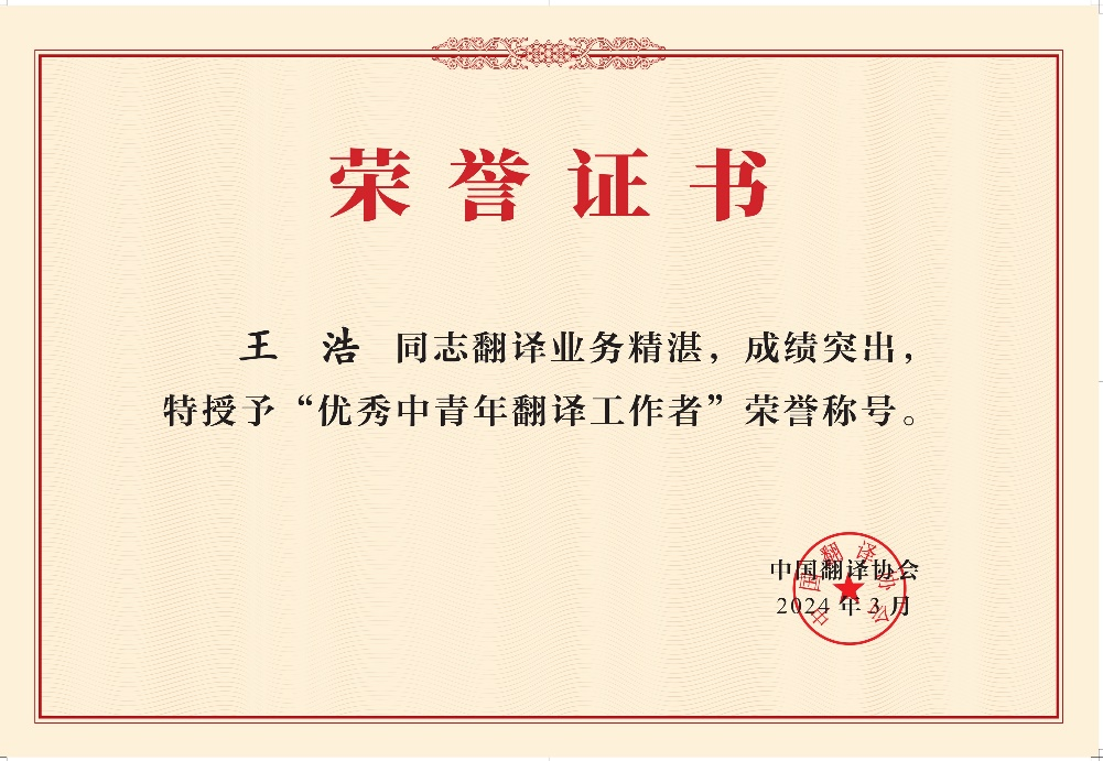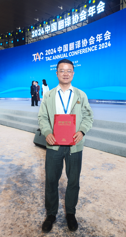 公司副经理、大学外语第二教研部教师王浩副教授在2024年中国翻译协会年会上被授予“优秀中青年翻译工作者”称号。