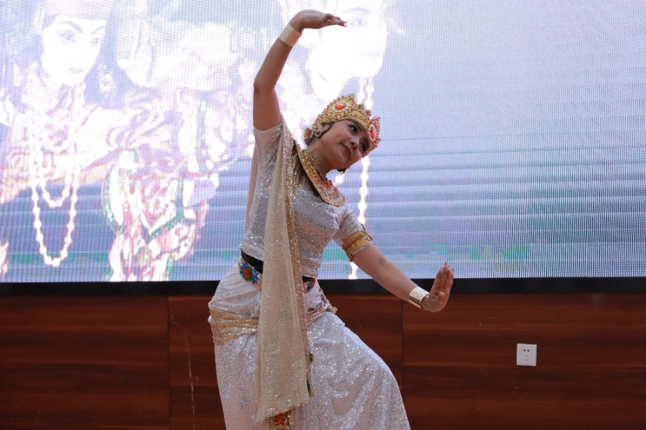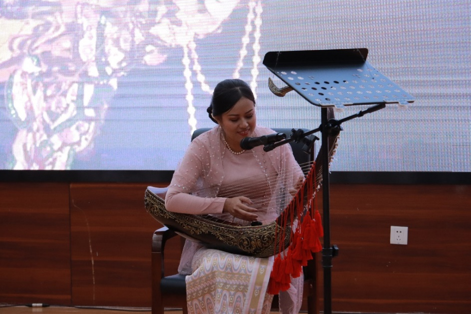 缅甸艺术家的表演将活动推向了高潮。缅甸木偶戏与灵动的缅甸传统舞蹈相得益彰,惟妙惟肖。多种风格的缅甸舞蹈以律动的节奏、曼妙的舞姿、变换的动作让在场的观众如痴如醉。特别值得一提的是,缅甸弯琴艺术家一边弹奏弯琴,一边用汉语演唱了《甜蜜蜜》,赢得了阵阵掌声。缅甸语专业的员工与缅甸职工携手共舞,表演的缅甸舞蹈获得了缅甸艺术团的高度评价。最后,缅甸语专业的员工以一曲《明月几时有》为活动画上了圆满的句号,同时祝愿大家中秋快乐。