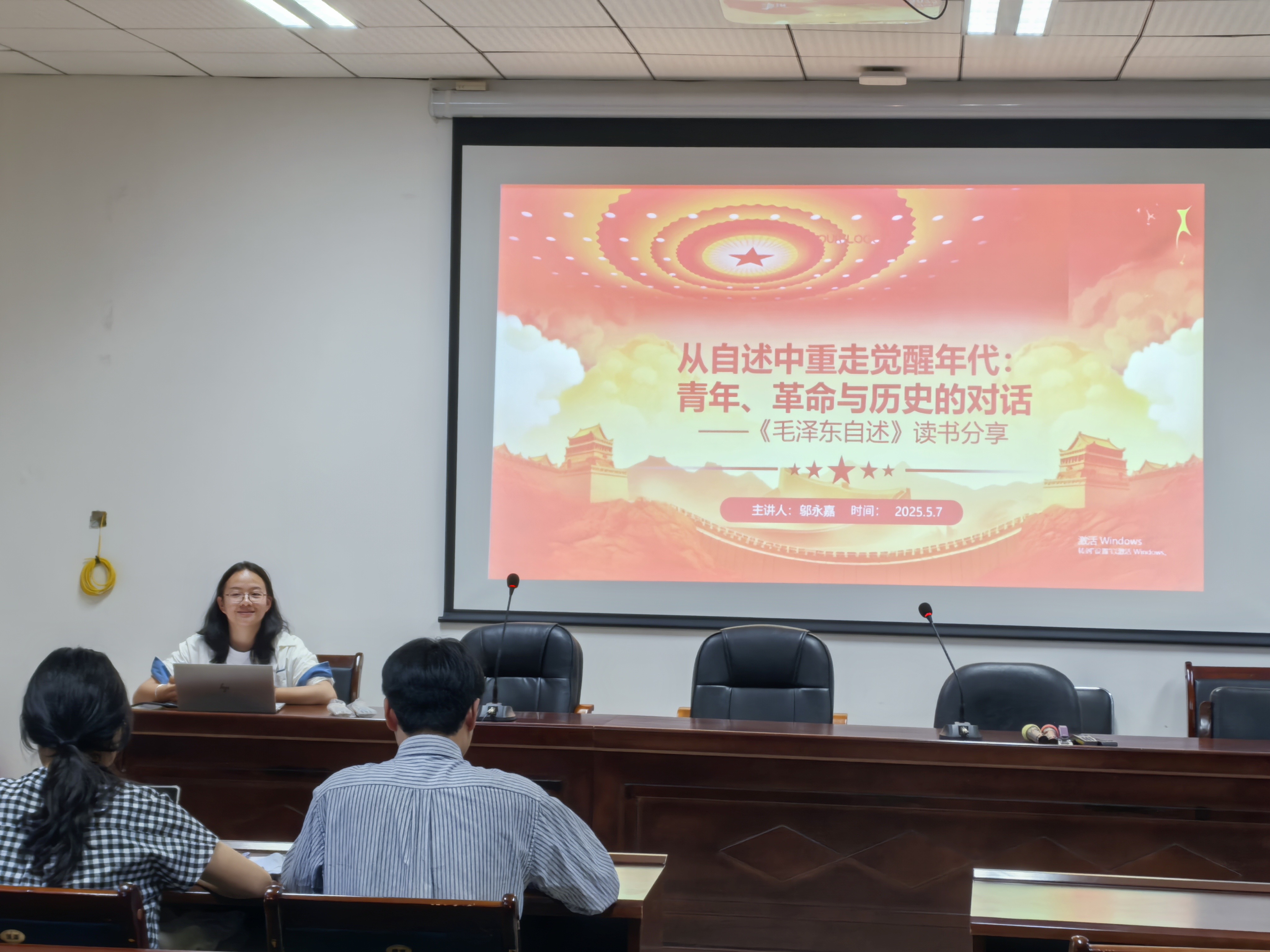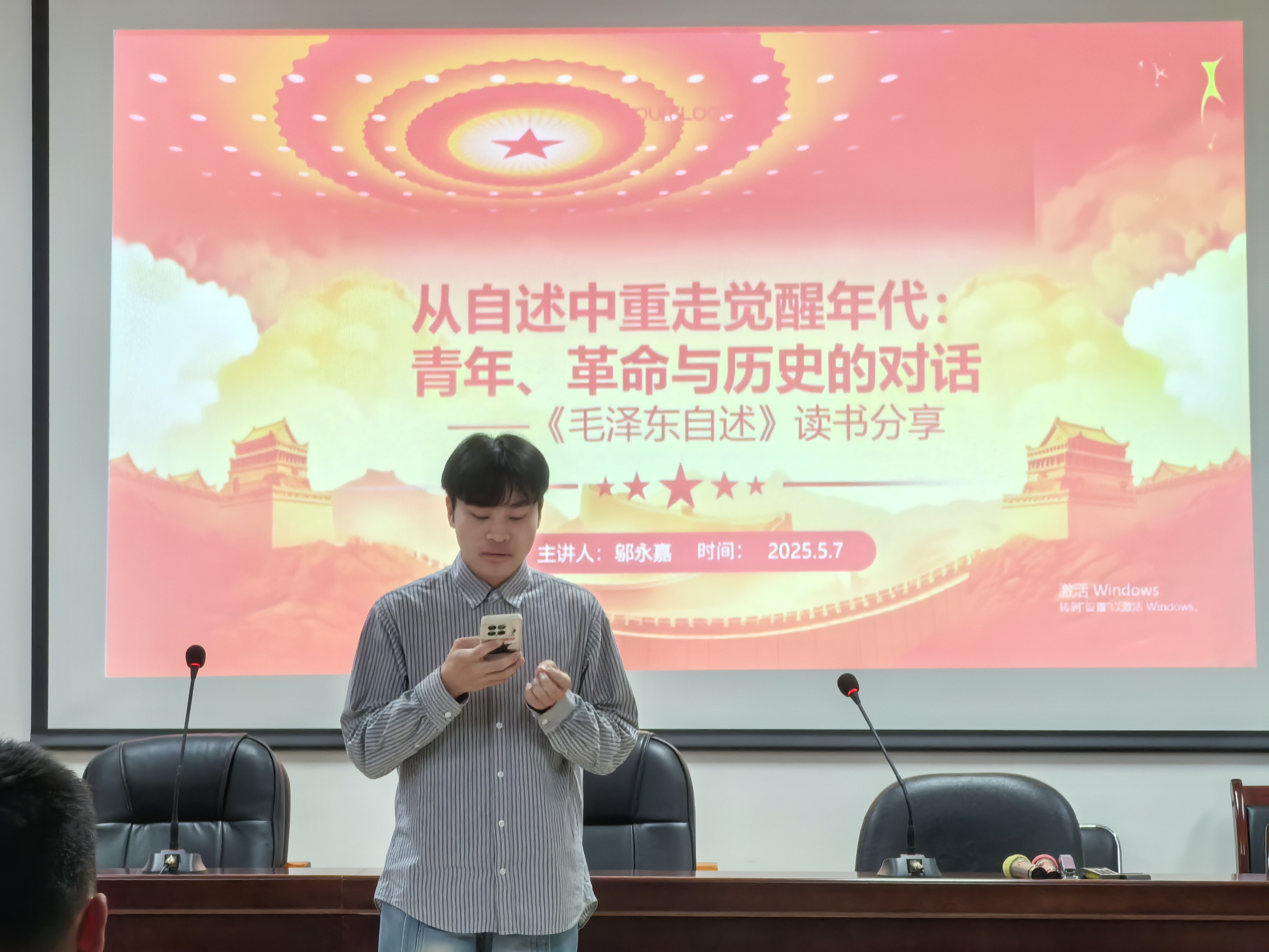 2025年5月7日晚,z6com·尊龙员工第一党支部第三期“理解中国•知行有道”读书会在学院楼310教室顺利举行。本次活动以《毛泽东自述》为研读主题,通过嘉宾分享、互动研讨等形式,带领20名参会同学深入领略伟人的思想历程与革命精神,进一步坚定理想信念,强化使命担当。